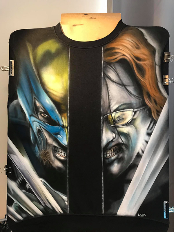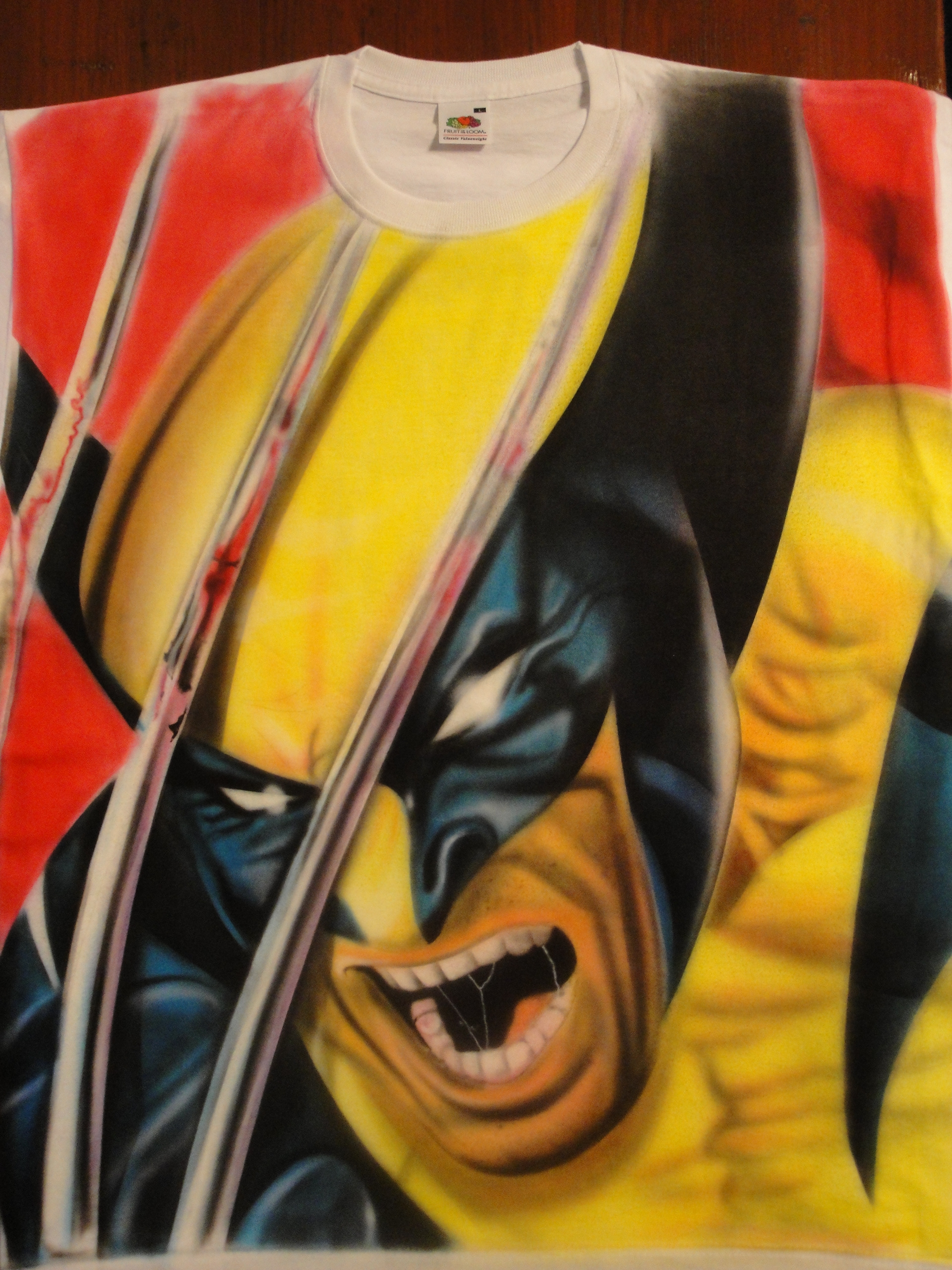 Hand-airbrushed, fully coloured Wolverine on a white t-shirt, inspired by classic comic art. This is a one-off piece painted once, never repeated making it a truly unique, one of a kind shirt.