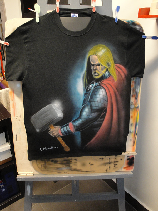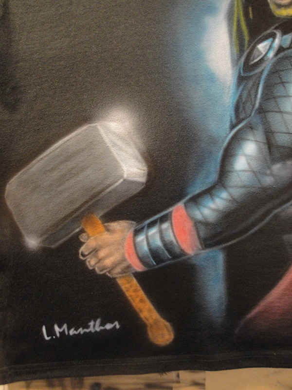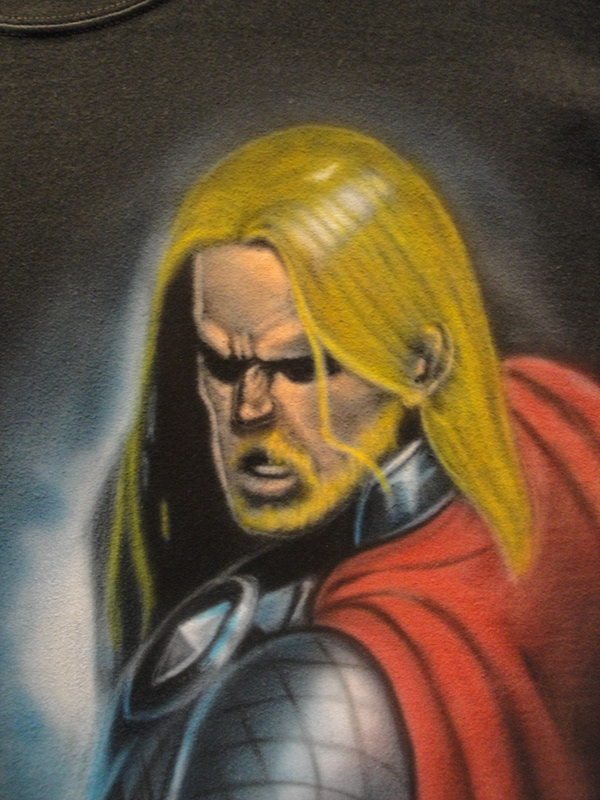Summon the power of the gods with this hand-airbrushed Thor design, strikingly rendered on a black t-shirt. Featuring intense detail, dramatic lighting, and the unmistakable presence of Mjölnir, this custom shirt brings comic book energy to wearable art. Ideal for superhero fans and anyone ready to make a mythic statement.