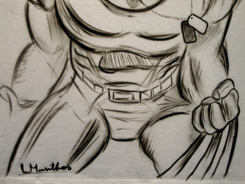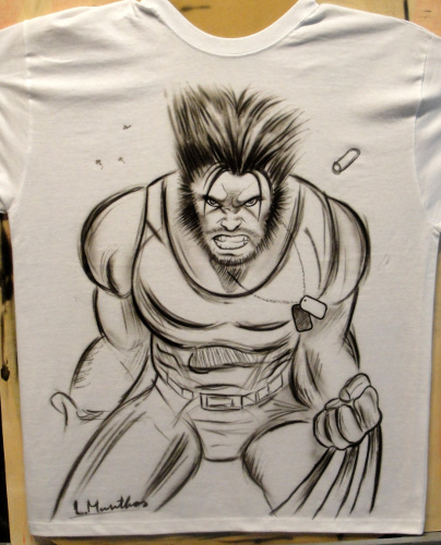 Hand-airbrushed Wolverine in a sketch-style comic look, painted in black and grey on a white t-shirt. Raw linework and hand-drawn details give it the feel of an original comic panel, making each piece unique.
