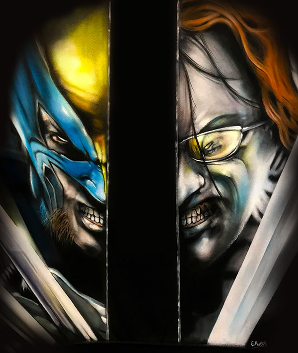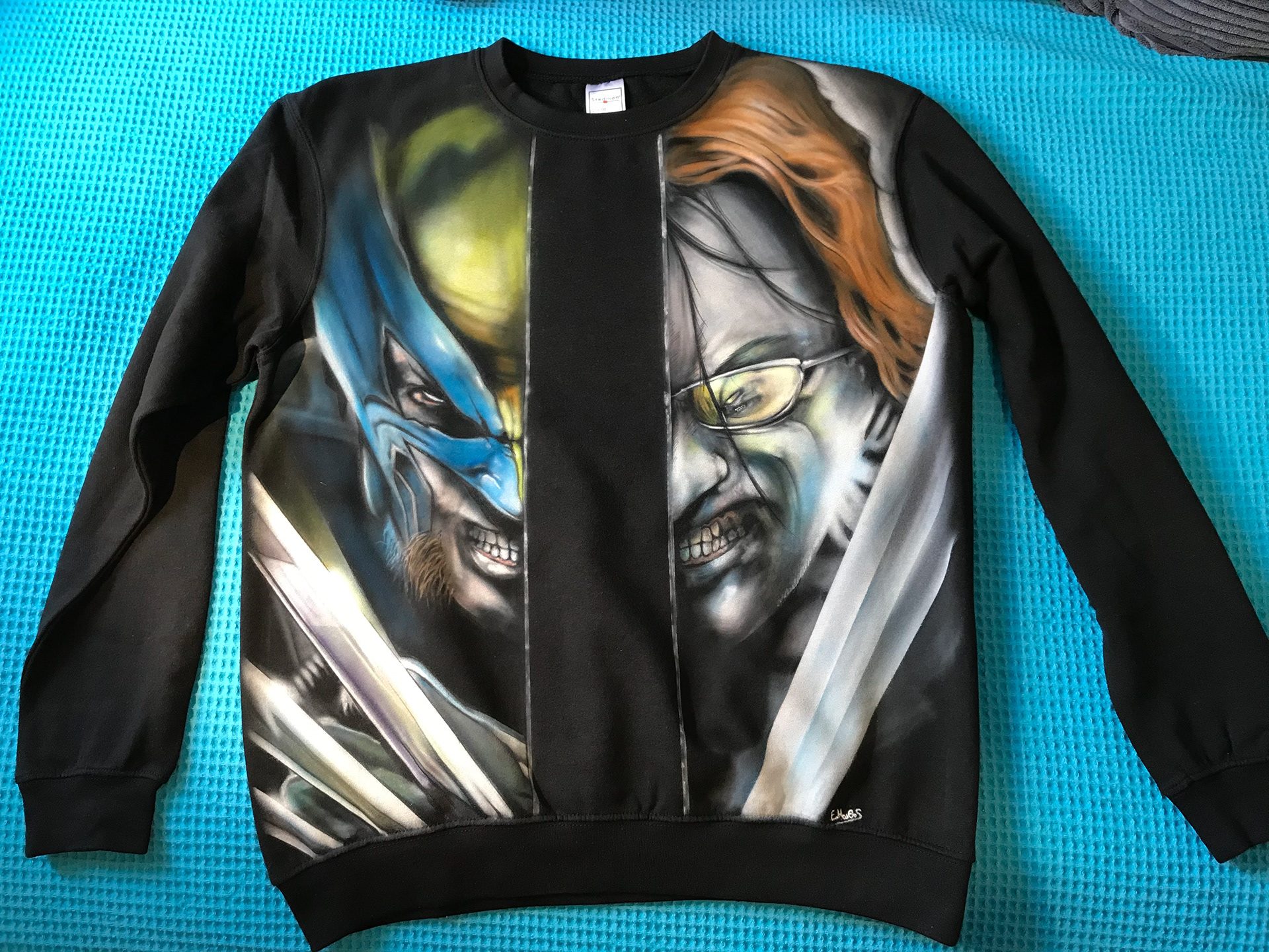 Two faces. One showdown. This hand-airbrushed black sweater captures the fierce intensity of Wolverine vs Mr-X, brought to life with razor-sharp detail, glowing color, and cinematic drama. Split down the middle with each warrior locked in a stare-off, it’s wearable storytelling for comic fans who want to stand out and show strength.