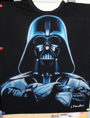 This hand-airbrushed design brings Darth Vader to life with bold highlights and menacing detail. The artwork captures the unmistakable presence of Star Wars’ most iconic villain, making it more than just a shirt — it’s a statement of power and fandom. Perfect for collectors, movie lovers, and anyone ready to channel the Dark Side in style.