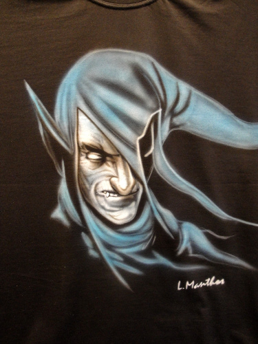 Sinister, sharp, and full of character — this hand-airbrushed Goblin design brings dark fantasy to life with bold lines and eerie detail. With its menacing grin and haunting presence, this shirt is a striking choice for fans of gothic style, fantasy art, or custom wearable creations.