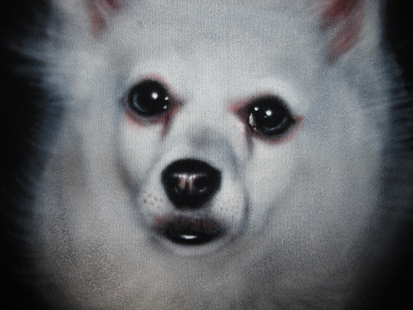 Photorealistic airbrushed portrait of Raska on a black t-shirt. Carefully layered paint and smooth shading capture her expression and fur with a clean, lifelike finish.
